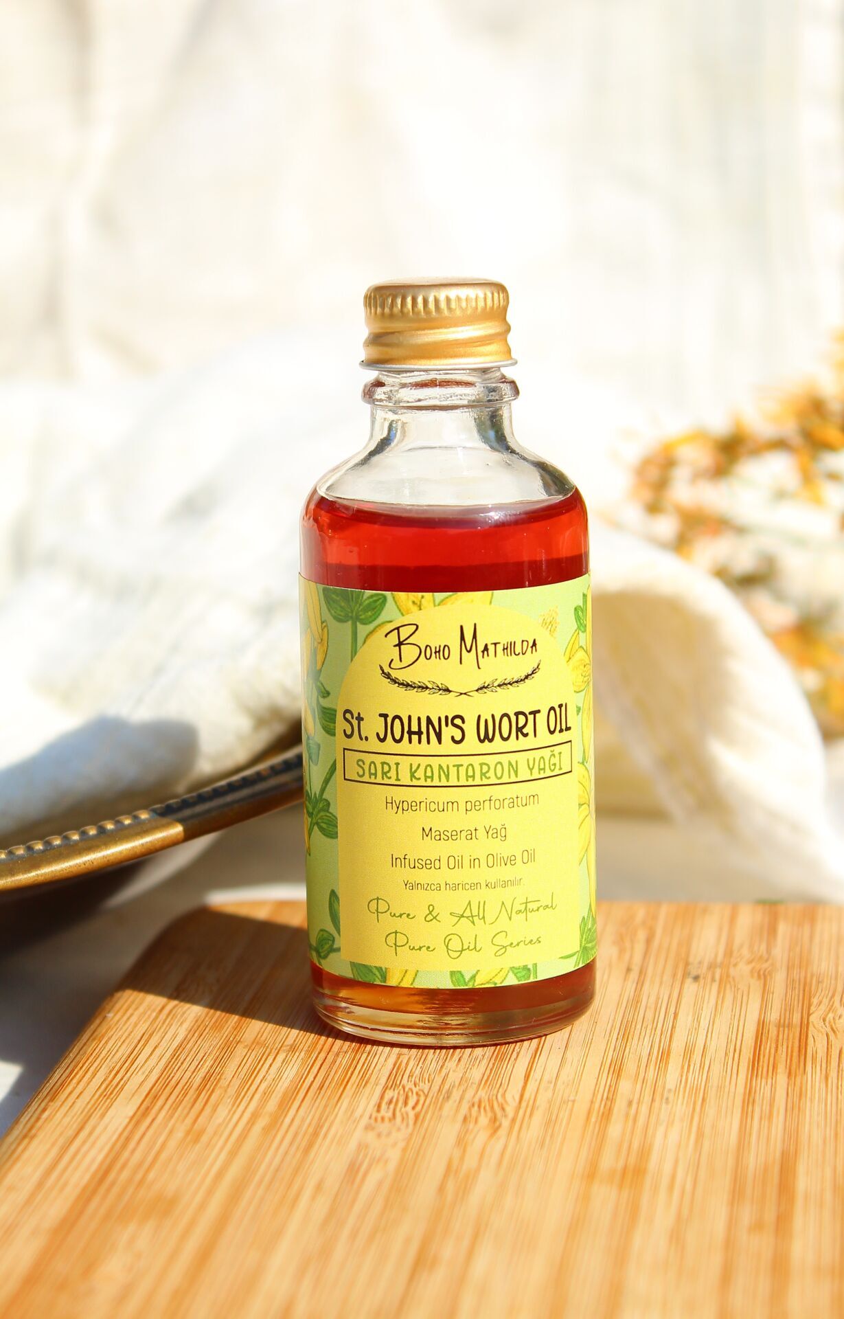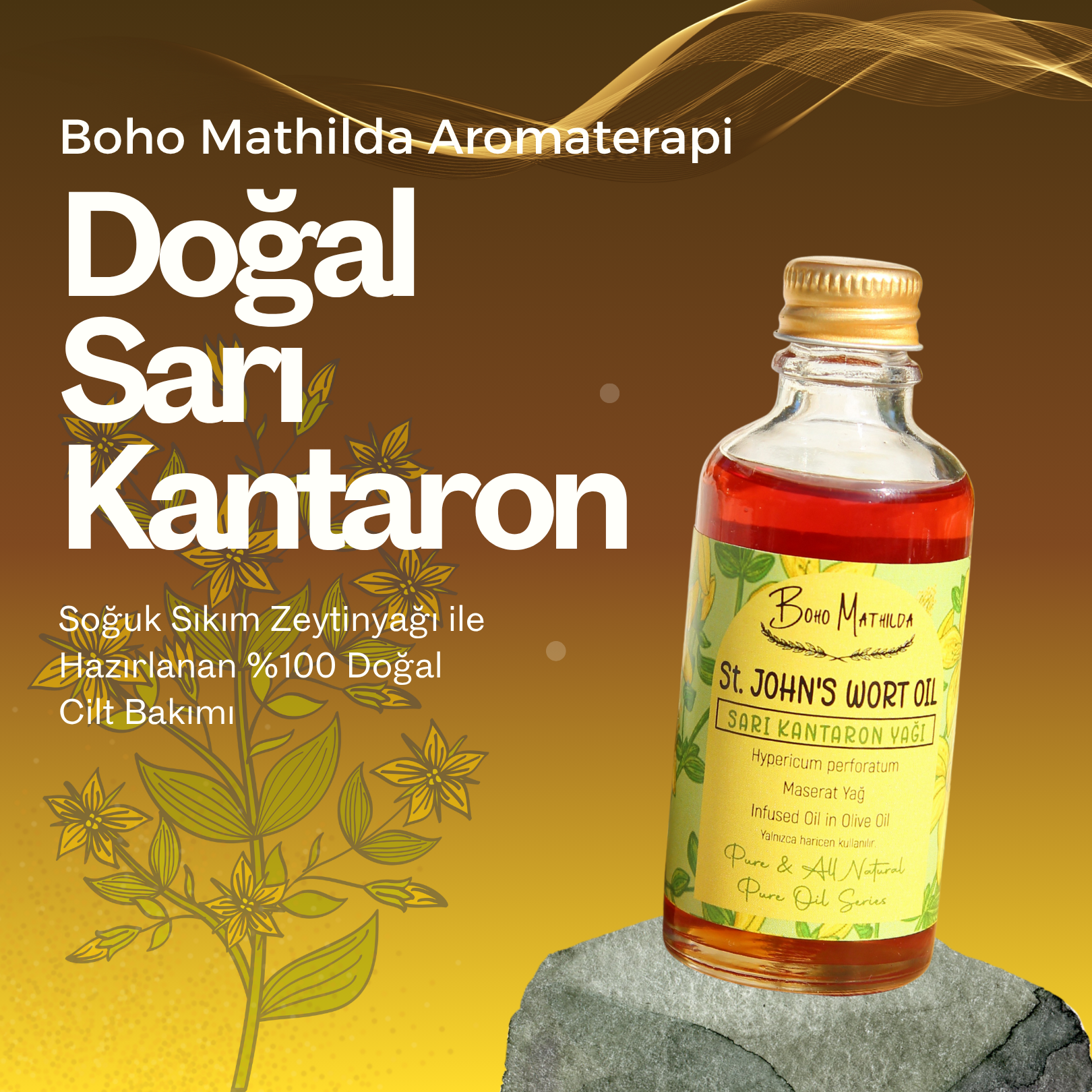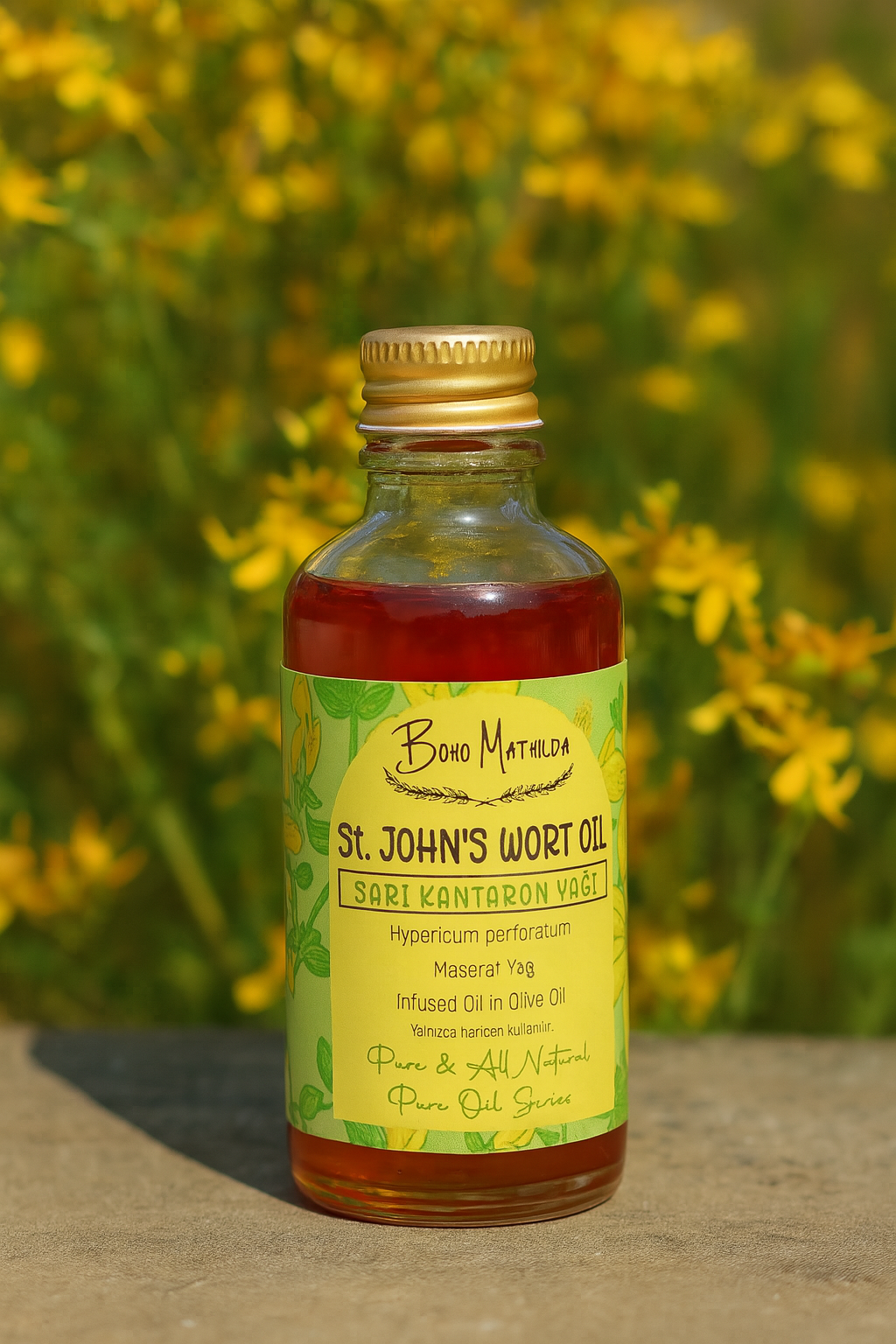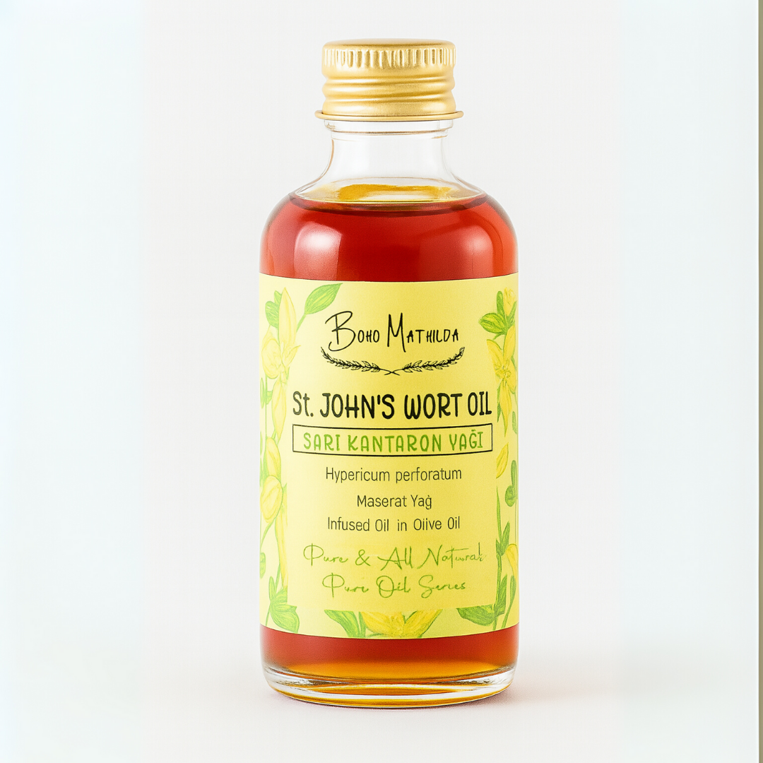 Boho Mathilda Aromaterapi olarak, doğaya saygılı üretim anlayışımızla, Sarı Kantaron Yağımızı özenle hazırlıyoruz. Haziran ve Temmuz aylarında, yüksek kesimlerde ve ormanlık alanlarda doğal olarak yetişen Sarı Kantaron (Hypericum perforatum) bitkisi, geleneksel yöntemlerle toplanır. Bitkiler, soğuk sıkım zeytinyağı içerisinde belirli süre bekletilerek (maserasyon yöntemiyle) bu özel bakım yağı elde edilir.