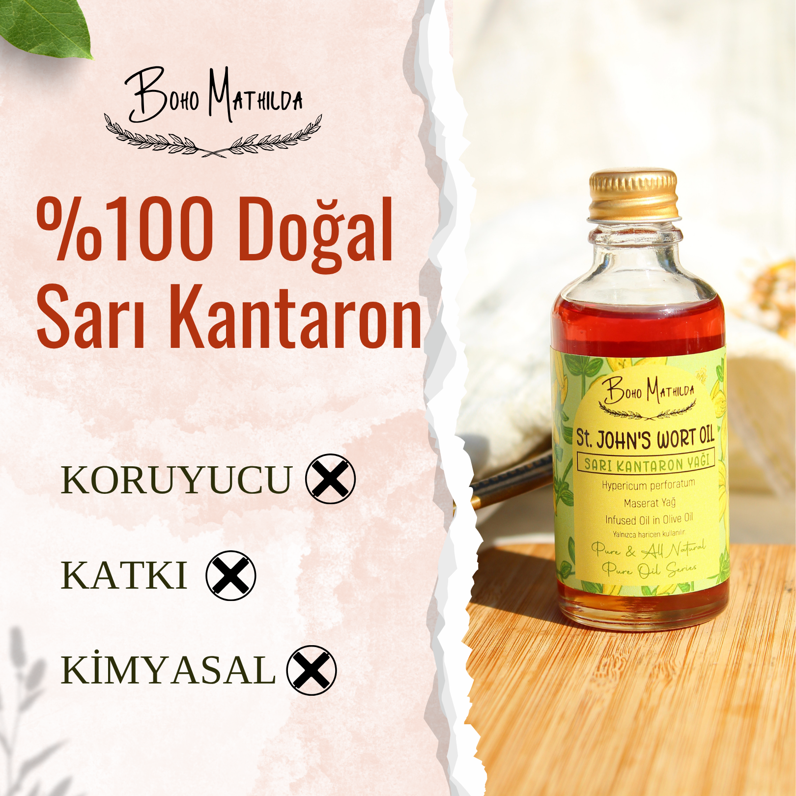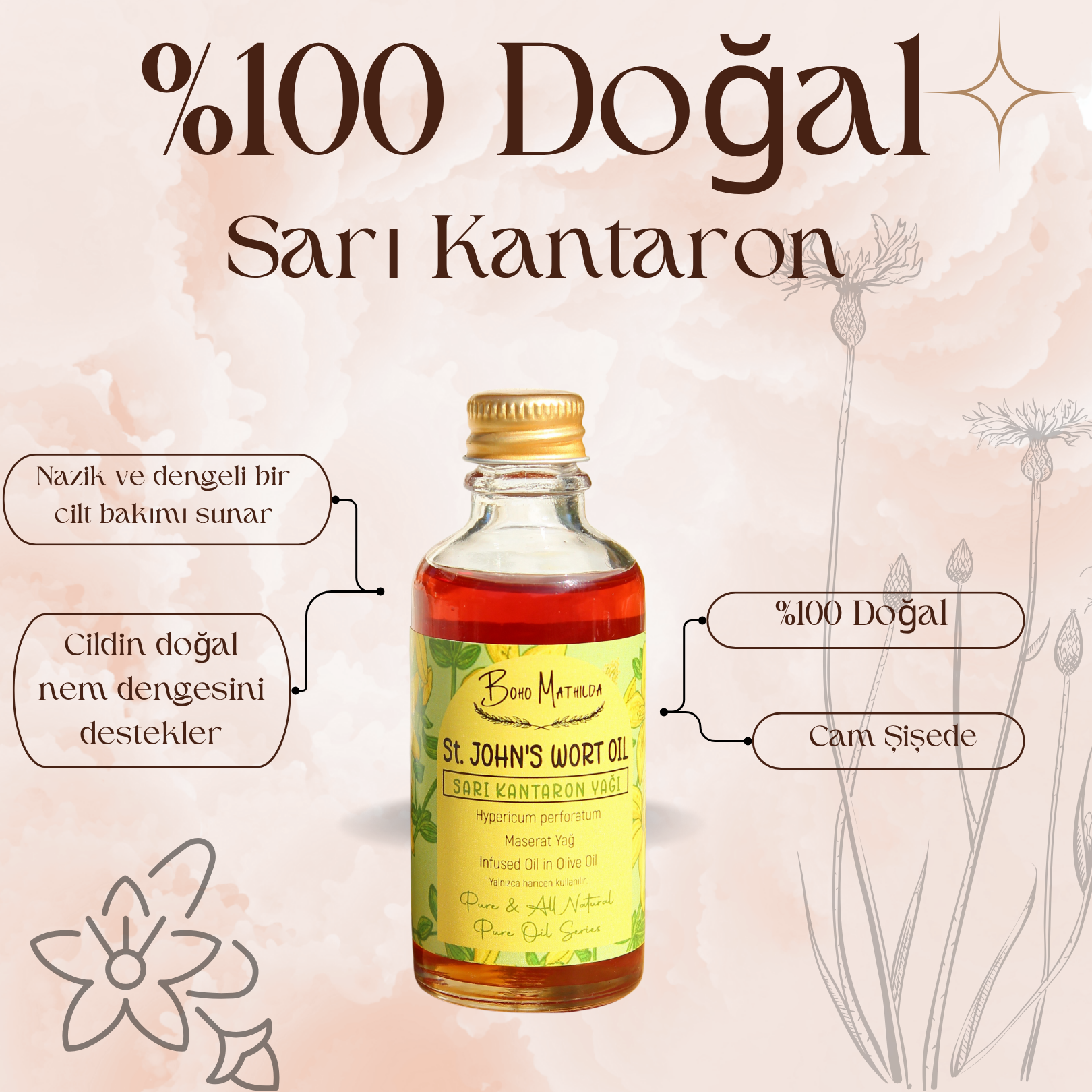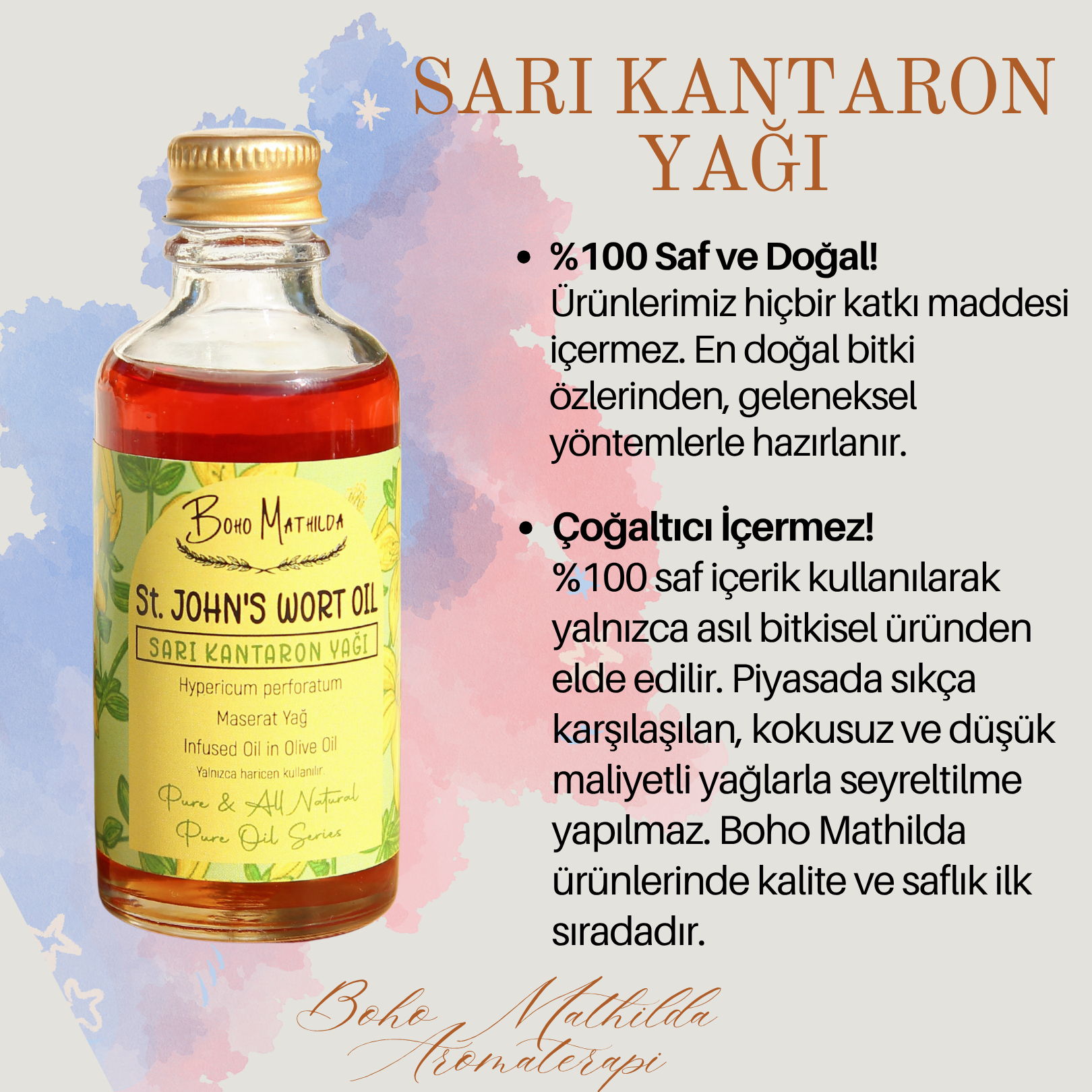 Boho Mathilda Aromaterapi olarak, doğaya saygılı üretim anlayışımızla, Sarı Kantaron Yağımızı özenle hazırlıyoruz. Haziran ve Temmuz aylarında, yüksek kesimlerde ve ormanlık alanlarda doğal olarak yetişen Sarı Kantaron (Hypericum perforatum) bitkisi, geleneksel yöntemlerle toplanır. Bitkiler, soğuk sıkım zeytinyağı içerisinde belirli süre bekletilerek (maserasyon yöntemiyle) bu özel bakım yağı elde edilir.