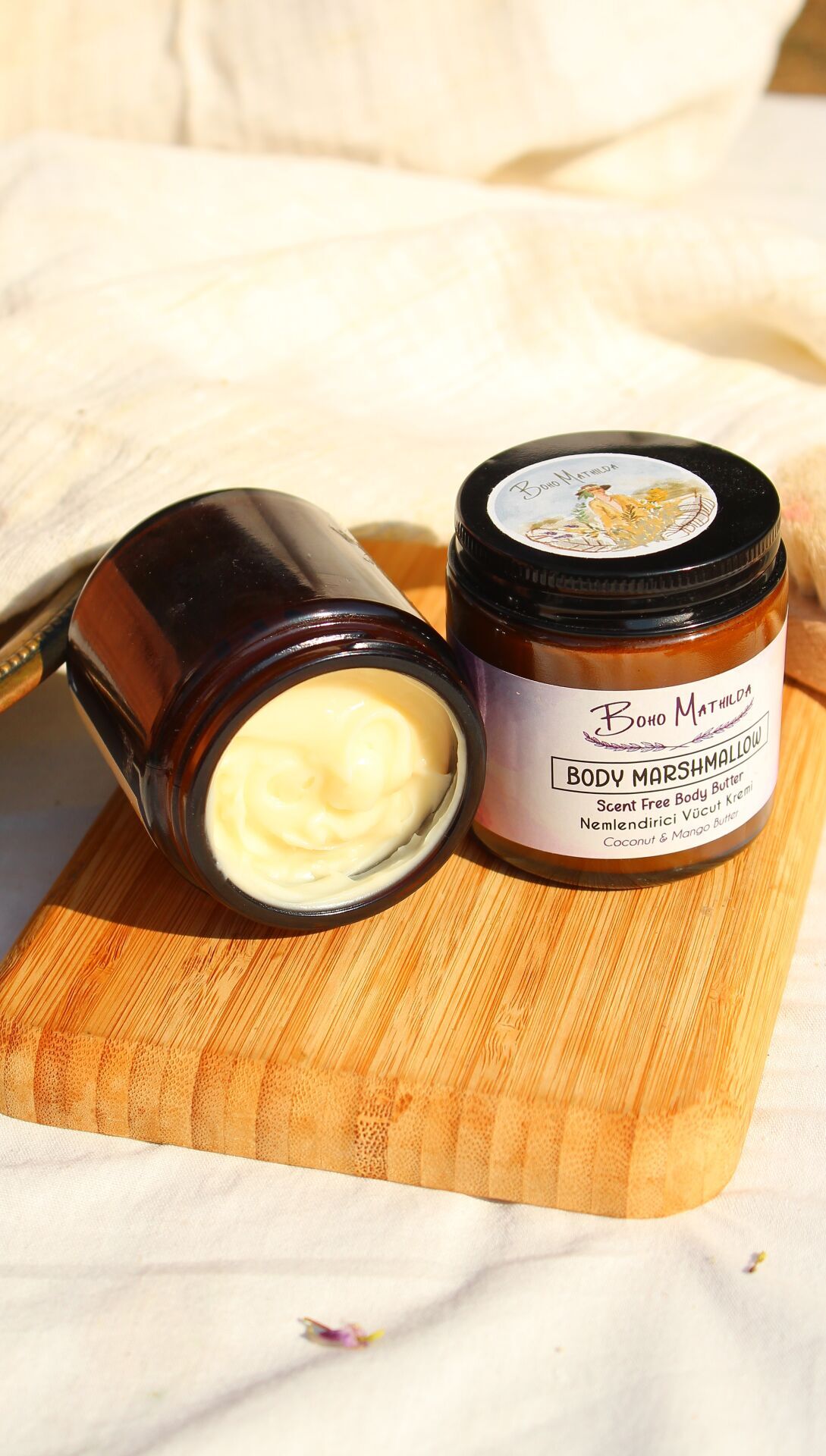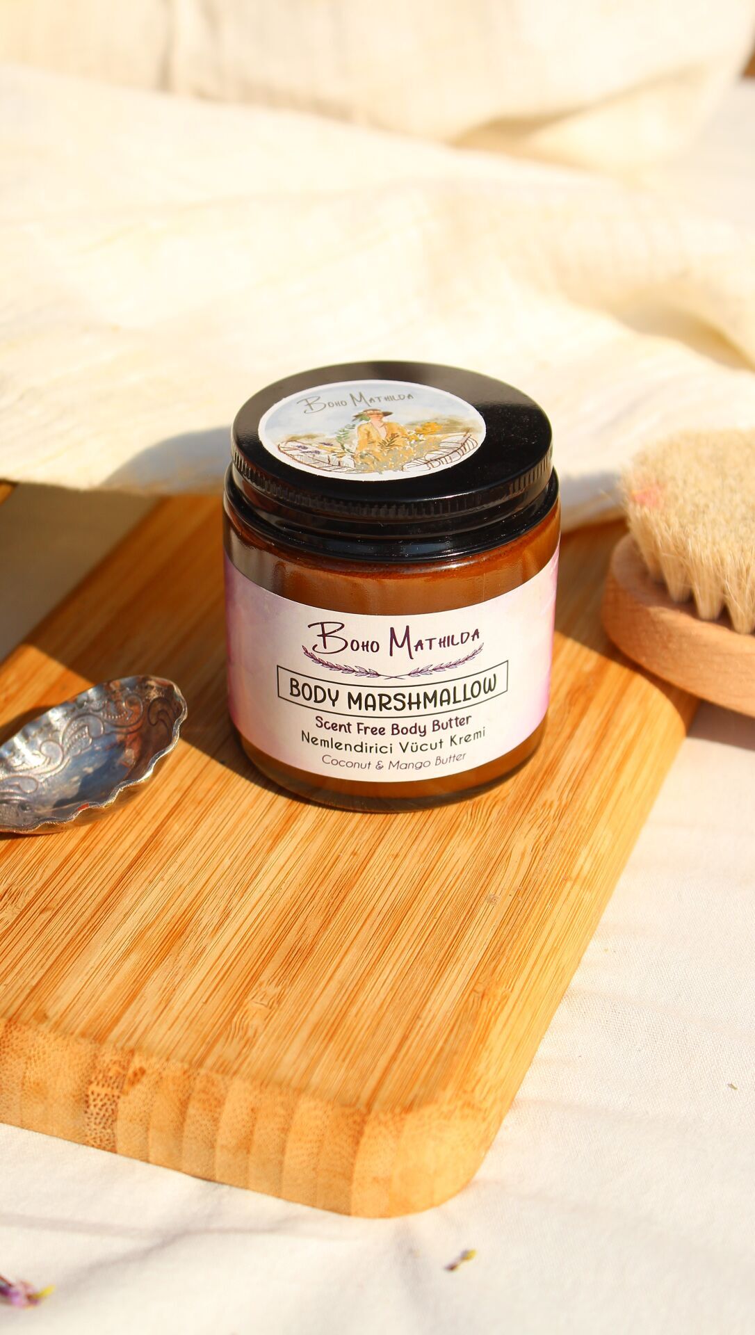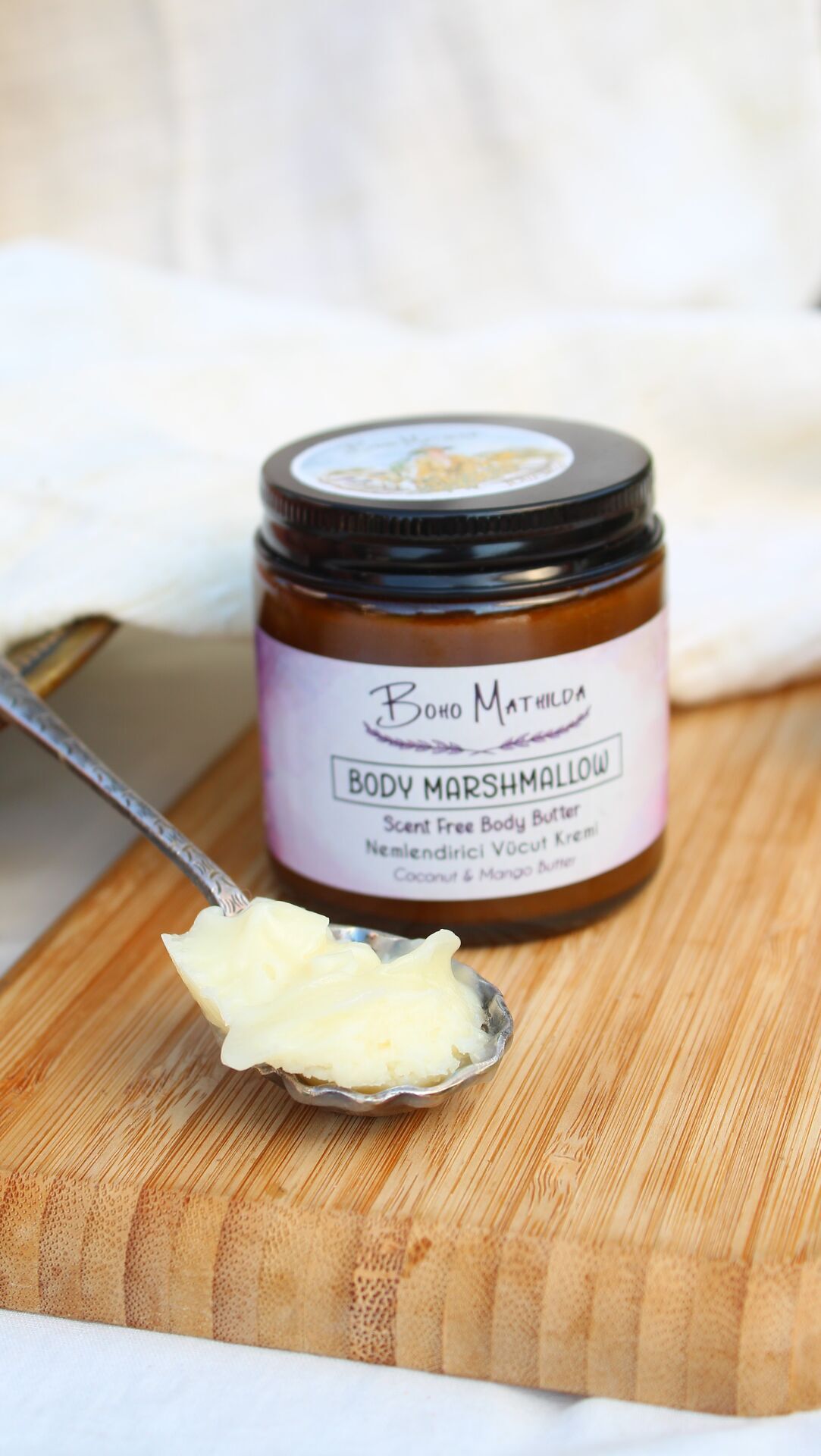 Tüm aile bireyleri rahatlıkla kullansın diye uçucu yağ eklemedik. İçindeki tüm sabit yağlar hızlı bir onarım sağlar. El, vücut, ayak bakımı için dilediğiniz sıklıkta ve miktarda kullanabilirsiniz. Hindistan cevizi yağı aşınmış, aşırı kuru ciltleri hızla onarır. Mango yağı ciltteki koyu lekeleri açmaya yardımcı olur. Cilde ışıltı verir. Cildi UV ışınlarından korumaya destek olur bu nedenle el nemlendiricisi olarak kullanımında doğal bir destek sunar. Kakao yağı cilde elastikiyet sağlar. Yara ve çatlakları onarıp cildi tazeler ve sebum dengesini yeniden sağlar. Vücut nemlendirici body marshmallow kremimiz formülü sayesinde çabuk emilir ve az miktarda kullanıma olanak sağlar böylece ekonomik bir ürün olmaya adaydır. Uçucu yağ içermemesine rağmen kakao ve mangonun zengin kokusu sizi mest edebilir.