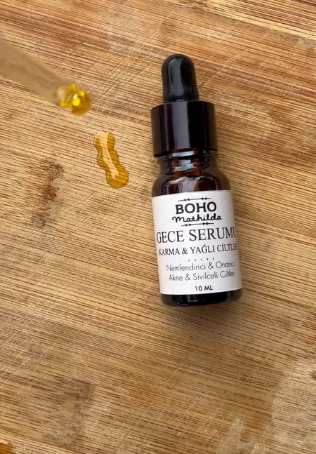 Yağlı ciltlerin en sık yaptığı hatalardan biri, ciltlerinin neme ihtiyaç duymadığını düşünmeleridir. Ancak her cilt tipi, sağlıklı, ışıltılı bir görünüm için düzenli nemlendirmeye ihtiyaç duyar. Boho Mathilda Aromaterapi’nin karma ve yağlı ciltler için özel olarak geliştirdiği gece serumu, sebum dengesini sağlarken fazla yağlanmayı azaltmaya yardımcı olur. Akne, sivilce ve lekeler üzerinde olumlu etkiler sunar. Gözenek sıkılaştırıcı özelliğiyle cildinize kapsamlı bir bakım sunar ve doğal bir parlaklık kazandırır.