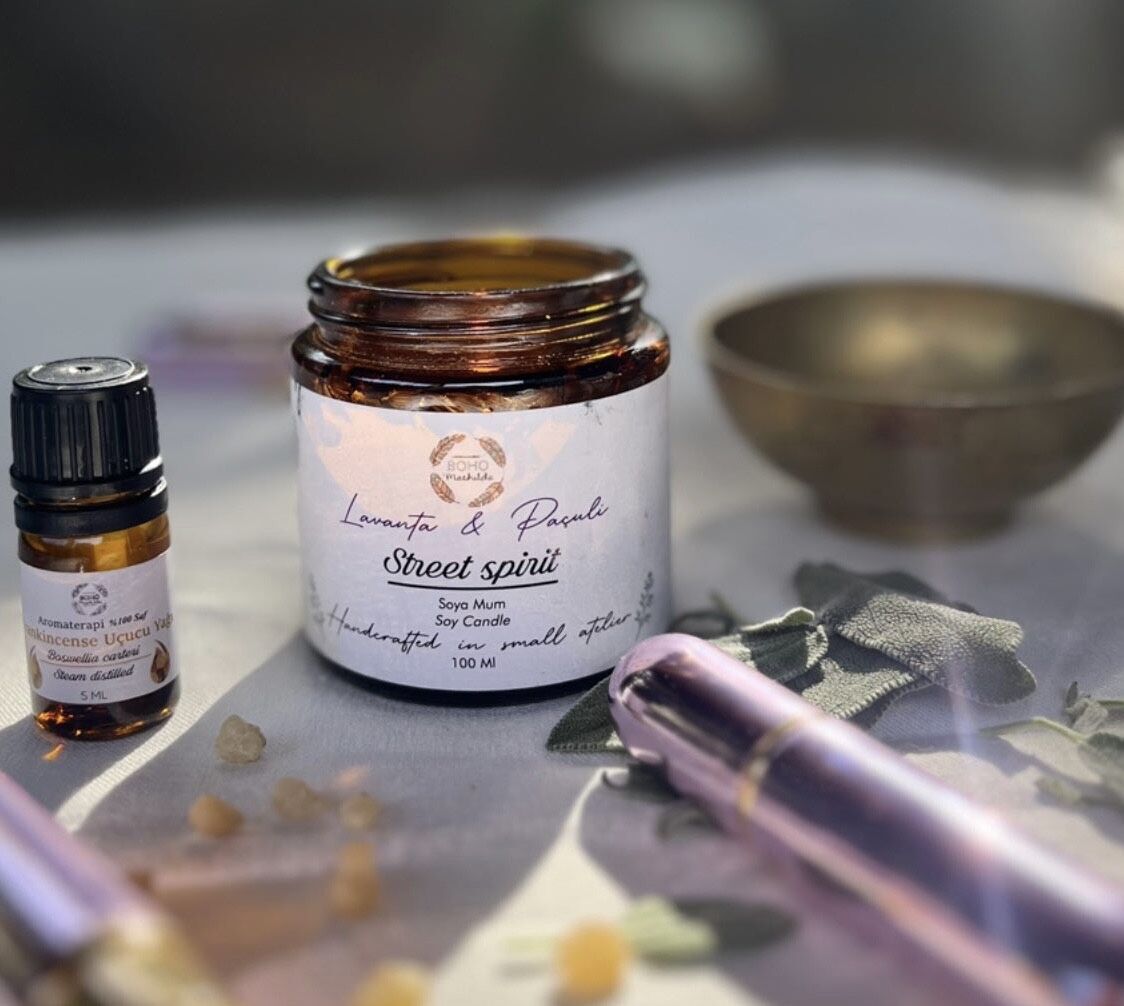 Hippilerin en çok kullandığı aromatik kokulardan biri olan Paçuli ile hem neşe hem dinginlik getiren Lavanta uçucu yağlarının sakinleştirici ve dengeleyici özellikleriyle birleşen bu soya mum ruhunuzu beslemeye hazır. Lavanta & Paçuli uçucu yağlarının uyumlu karışımı, hem çevrenize ferah bir atmosfer katar hem de içsel dengeyi sağlamak için mükemmel bir destek sunar. Paçuli, toprağa yakın, derin ve rahatlatıcı kokusuyla stresi azaltırken, Lavanta, sakinleştirici etkisiyle zihni dinginleştirir ve uykuya dalmayı kolaylaştırır.Özellikle açık alanlarda böcek kovucu etkisiyle mekanlarınızda doğal bir koruma sağlar. Soya mumlar, geleneksel parafin mumların aksine çevre dostudur ve tamamen doğal malzemelerle üretilmiştir. Mum yanarken uçucu yağların iyileştirici özelliklerini solur, bulunduğunuz alanın havasını tazeler ve huzurlu bir atmosfer oluşturur. 100 ML’lik soya mum 72 saat boyunca kesintisiz yanarak uzun süreli keyifli bir kullanım sunar. Ayrıca, aromaterapi mumları parafinli mumların aksine, söndürüldüğünde aynı noktada yeniden donarak tekrar yanmaya başlar, bu da onlara uzun ömürlü ve verimli bir kullanım sağlar.